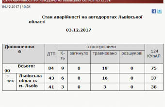 У Львівському обласному управлінні поліції повідомили сьогодні, 4 грудня, що вчора його працівники зареєстрували на дорогах Львівщини 90 ДТП, унаслідок яких були травмовані19 людей. Зокрема, у Львові поліціянти зафіксували 43 ДТП, унаслідок яких були травмовані троєлюдей. Як інформував «ЩЛ», медики шпиталізували на Львівщині п’ятьох пасажирів автобуса.