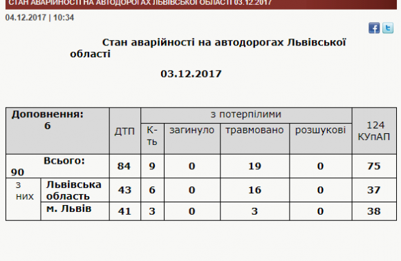 У неділю, 3 грудня, на дорогах Львівщини були зафіксовані 90 дорожньо-транспортних пригод.
