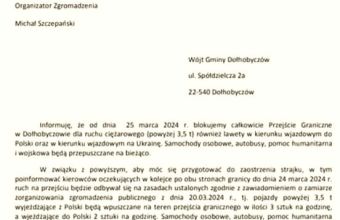 Як випливає з документа, польські фермери страйкарі повідомили місцеву владу, що з 25 березня 2024 року, повністю закривають ПП Долгобичув для вантажного руху масою понад 3,5 т (ДПМ).