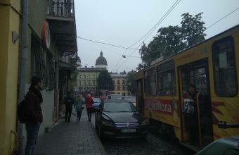 Автомобіль на трамвайній колії гальмує рух транспорту на початку вулиці Богдана Хмельницького.