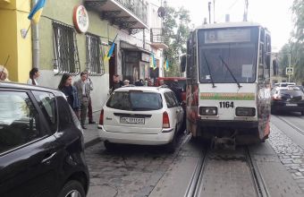 Електротранспорт простоює на початку вулиці Богдана Хмельницького.