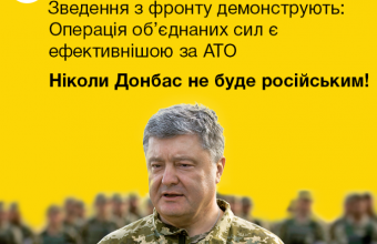 «Зведення з фронту демонструють: операція об’єднаних сил є ефективнішою за АТО. Ніколи Донбас не буде російським!», – запевнив Петро Порошенко.