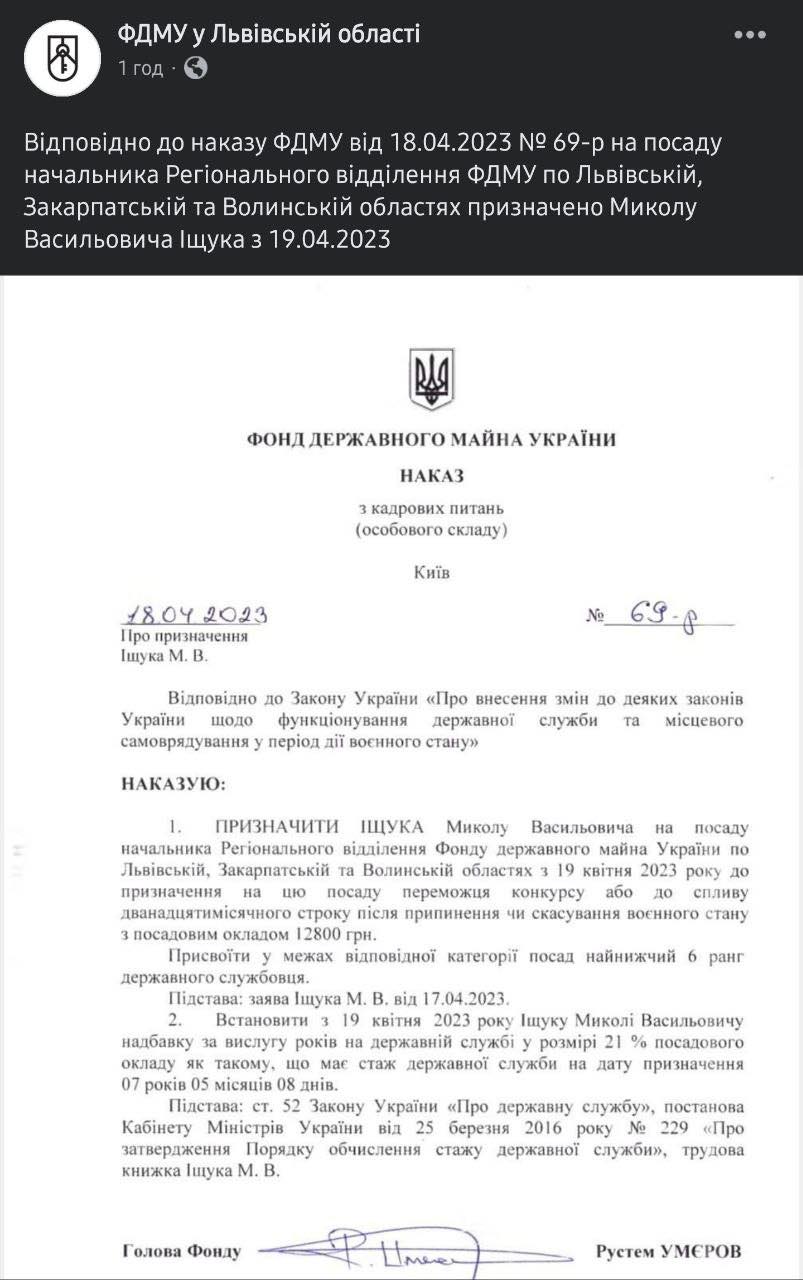 Відповідно до наказу ФДМУ від 18.04.2023 № 69-р на посаду начальника Регіонального відділення ФДМУ по Львівській, Закарпатській та Волинській областях призначено Миколу Васильовича Іщука з 19.04.2023.
