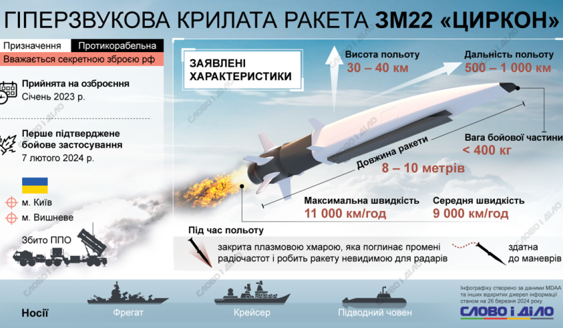 Офіційно Росія не оприлюднює характеристики ракети "Циркон" і не демонструє її публічно, однак у різний час озвучувала окремі параметри.
