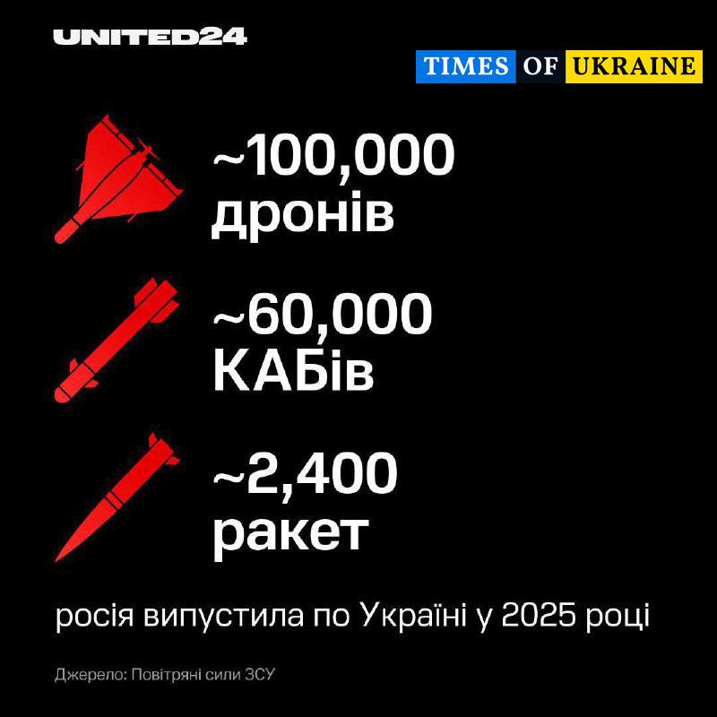 У 2025 році Росія випустила по Україні понад 60 000 керованих авіаційних бомб, близько 2400 ракет різних типів і понад 100 000 безпілотників.