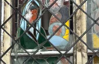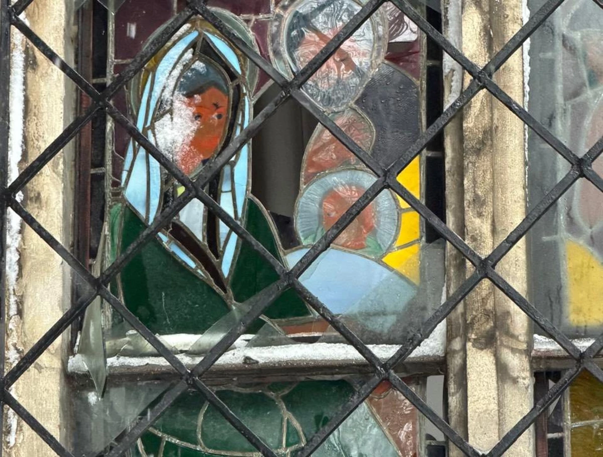 Пошкоджені вітражі авторства Валерія Шаленка у церкві (на фото), а також віконні заповнення у будівлі школи.