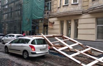 У п’ятницю, 7 грудня, о 14: 40 на легковий автомобіль, який прямував вулицею Фредра у Львові, впало риштування, яке, відтак, заблокувало рух транспорту.