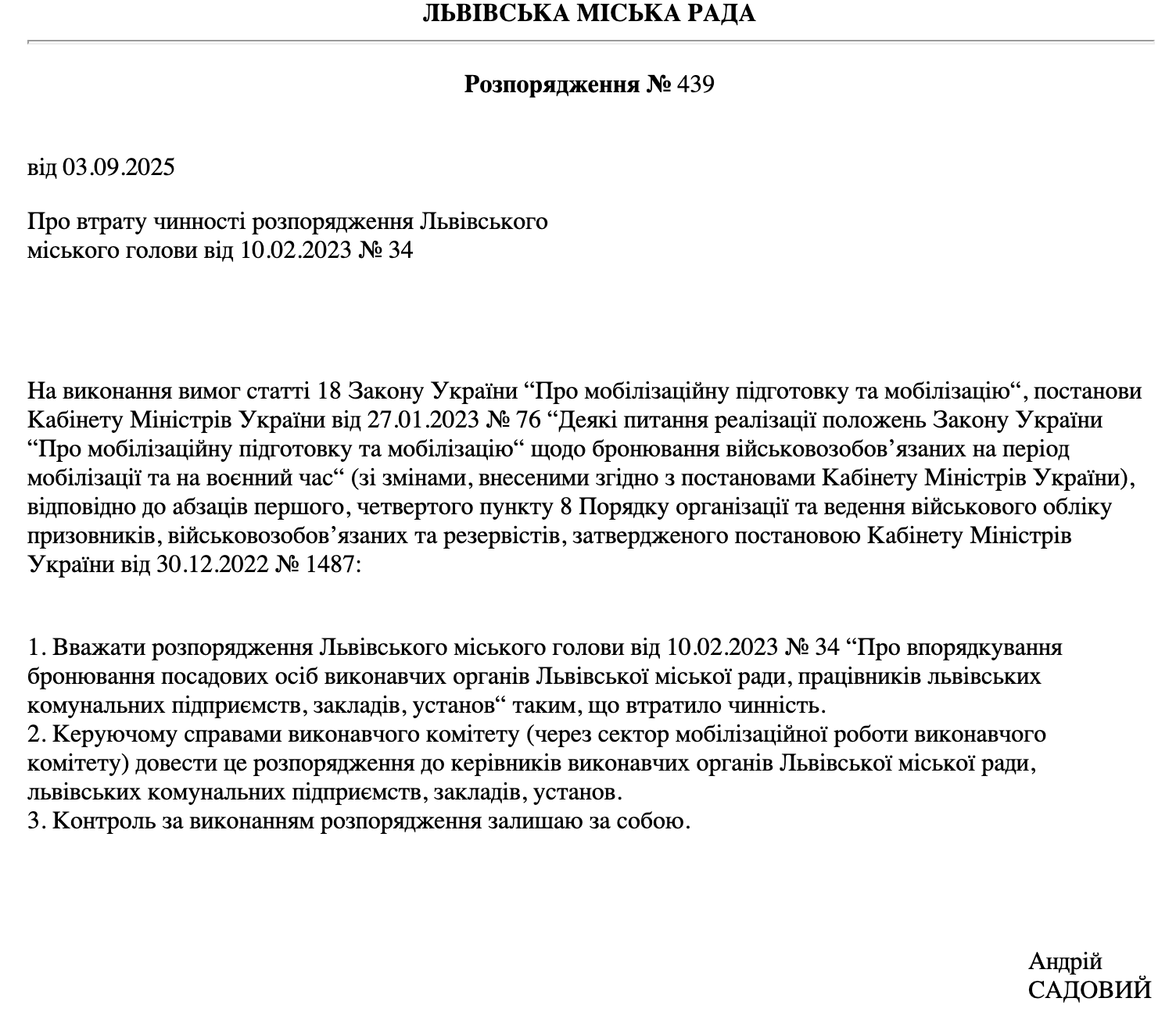Третього вересня цього року міський голова Львова Андрій Садовий видав розпорядження №439, яким скасував своє ж розпорядження №34 від 10 лютого 2023 року. DailyLviv.com подає резолютивний текст останнього документу: