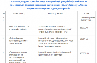 Виконавчий комітет ЛМР затвердив перелік соціально-культурних проектів громадських організацій у галузі «Соціальний захист», яким надається фінансова підтримка за рахунок коштів міського бюджету Львова, й суми їх спів фінансування.