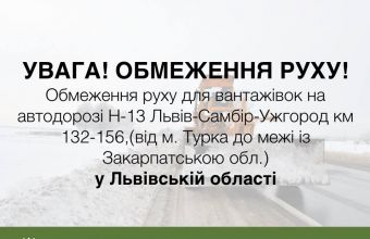 Зокрема, рух вантажівок обмежено з 9:00 середи, 4 січня, на ділянці автомобільної дороги державного значення М-06 Київ-Чоп 621-702 км (від Стрия до межі із Закарпатською областю). Окрім того, з 10:30 год обмежено рух вантажного автомобільного транспорту на ділянці автомобільної дороги державного значення Н-13 Львів-Самбір-Ужгород 132-156 км (від Турки до межі із Закарпатською області).