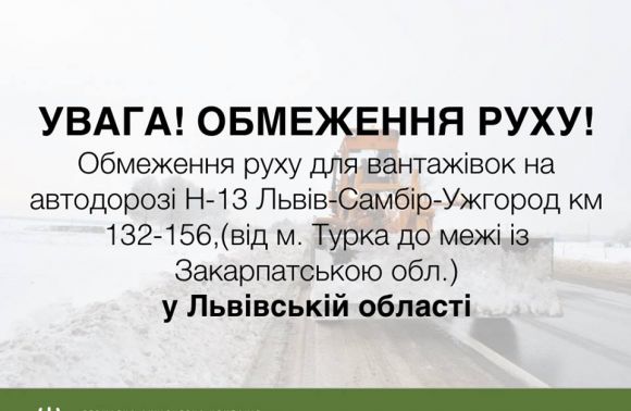 Зокрема, рух вантажівок обмежено з 9:00 середи, 4 січня, на ділянці автомобільної дороги державного значення М-06 Київ-Чоп 621-702 км (від Стрия до межі із Закарпатською областю). Окрім того, з 10:30 год обмежено рух вантажного автомобільного транспорту на ділянці автомобільної дороги державного значення Н-13 Львів-Самбір-Ужгород 132-156 км (від Турки до межі із Закарпатською області).