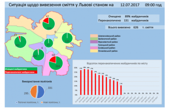 Заступник міського голови Львова з питань ЖКГ Сергій Бабак повідомив у середу, 12 липня, що сьогодні на контейнерних майданчиках у Львові все ще залишається невивезеними понад 4604 тонни сміття. Чиновник також поінформував: «За попередню добу з міста було вивезено 626 тонн твердих побутових відходів, зокрема, 331 тонну – за угодами, які перевізники мали укладені раніше, а 295 тонн – за домовленостями, які уклали після комісії з питань техногенно-екологічної безпеки та надзвичайних ситуацій».