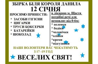 «У звязку зі святами – наступна збірка біля короля Данила відбудеться в понеділок, 12 січня 2015 року!!! Дуже просимо принести дитячі речі для немовлят – 0-6 місяців – в лікарні в міста Щастя (в Новоайдарському районі Луганщини. – «ЩЛ»).