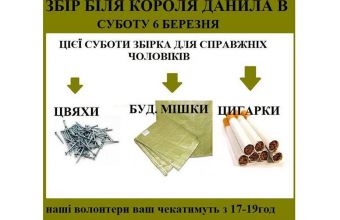 На сторінці громадської ініціативи «Допоможи фронту» в інтернет-мережі «Facebook» розмістили ілюстроване повідомлення про те, що сьогодні, 7 березня, 7 березня, зі 17.00 до 19.00 волонтери збиратимуть для бійців біля пам’ятника королю Данилу на площі Галицькій у Львові цвяхи, будівельні мішки й сигарети. «ТРЕБА ЦВЯХІВ, ДУЖЕ, ДУЖЕ!», – наголошують волонтери.