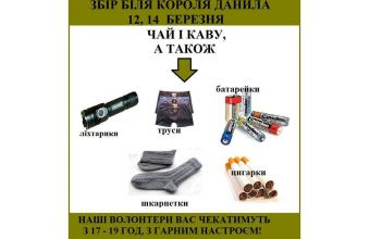 Активіст громадської ініціативи «Допоможи фронту» Любов Возняк розмістила на своїй сторінці в інтернет-мережі «Facebook» ілюстроване повідомлення про те, що волонтери знову збиратимуть сьогодні, 14 березня, допомогу бійцям на передовій біля пам’ятника королю Данилу на площі Галицькій у Львові, й написала також: