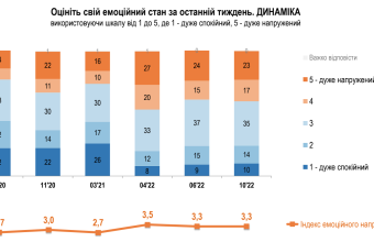 Індекс психологічного виснаження все ще є достатньо помірним (2.0). У динаміці від квітня до жовтня 2022 року він не змінився, окрім у показнику довіри до людей (знизилася).