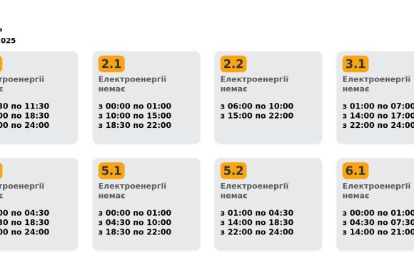 Група 6.2. Електроенергії немає з 00:00 до 01:00, з 10:00 до 15:00, з 18:30 до 22:00.