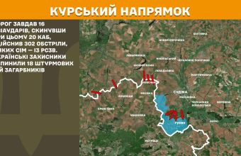 Сили оборони України продовжують операцію в Курській області. Минулої доби ворог завдав 16 авіаударів, скинувши при цьому 20 КАБ, здійснив 302 обстріли, з яких сім — із РСЗВ. Українські захисники зупинили 18 штурмових дій загарбників.