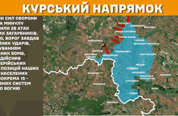 В операційній зоні на Курщині підрозділи Сил оборони України за минулу добу відбили 28 атак російських загарбників. Крім цього, ворог завдав 44 авіаційних ударів, зі застосуванням 64 керованих бомб, а також здійснив 544 артилерійських обстрілів позицій наших військ та населених пунктів, зокрема 15 - з реактивних систем залпового вогню.