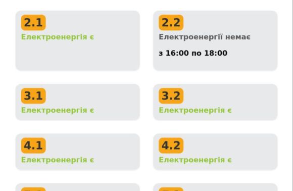Група 2.2. Електроенергії немає з 16:00 до 18:00.