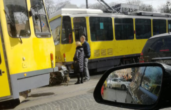 Трамваї стоять біля Стрийського ринку у Львові через зіткнення одного з них із легковиком.