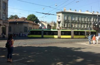 Пантограф трамвая не дістає дроту на перетині вулиць Антоновича й Бандери.