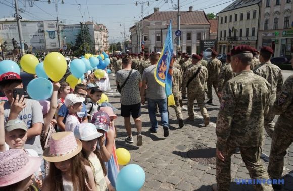 Сотні жителів Чернівців урочисто зустріли десантників, які повернулися зі зони проведення операції об'єднаних сил після восьми місяців виконання завдань на сході країни.