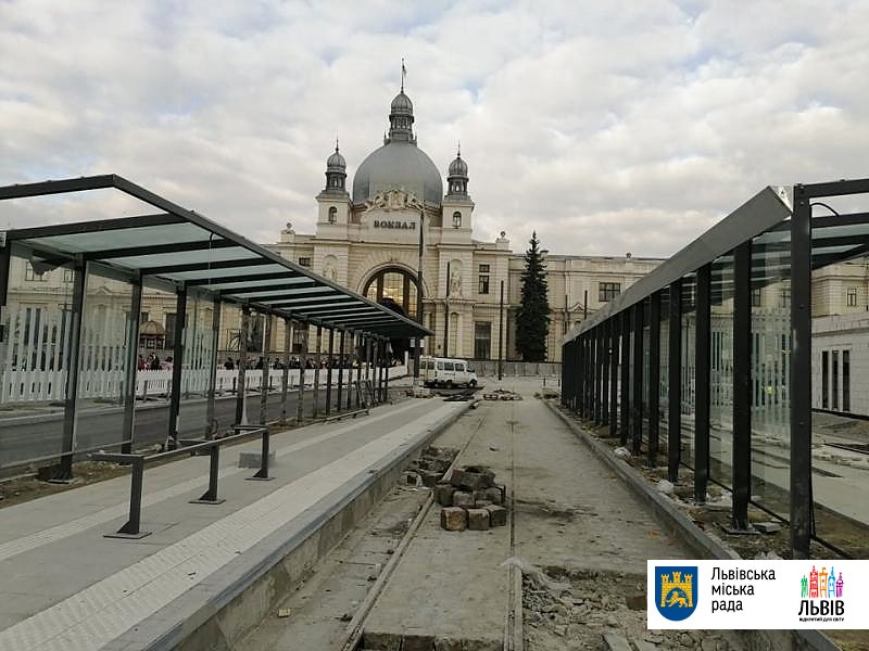 Про це повідомили в четвер, 31 жовтня, у Львівській міськраді, де також розповіли: «Вже практично сформований простір, де буде зупинятися громадський транспорт біля вокзалу. Це платформи, павільйони трамваїв і автобусів. Більшість плитки вже замощена».