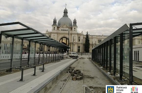 Про це повідомили в четвер, 31 жовтня, у Львівській міськраді, де також розповіли: «Вже практично сформований простір, де буде зупинятися громадський транспорт біля вокзалу. Це платформи, павільйони трамваїв і автобусів. Більшість плитки вже замощена».