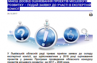 У Львівській обласній раді триває прийом заявок до складу експертної комісії, яка здійснюватиме у 2018 році оцінювання проектів у рамках програми проведення обласного конкурсу проектів місцевого розвитку на 2017-2020 роки.