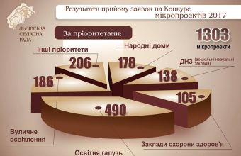 За пріоритетами конкурсанти найбільше заявок подали: на освітню галузь – 490, на інші пріоритети – 206, щодо вуличного освітлення – 186, щодо Народних домів – 178, щодо дошкільних навчальних закладів. – 138 та заклади охорони здоров'я – 105.