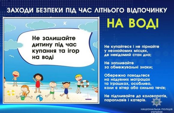 «Серед інших небезпек, які підстерігають дітей влітку – небезпека потрапити у непередбачувану ситуацію на воді. Часто забави зі стрибками у воду, змагання у плаванні та катання на різноманітних плавзасобах, зроблених з підручних матеріалів, завершуються неприємностями – і добре, коли поруч є хтось - чи товариш, чи випадковий очевидець, хто має відповідні навички і може врятувати дитину, котра наковталась води і тоне», – поінформували також в обласному управлінні поліції.
