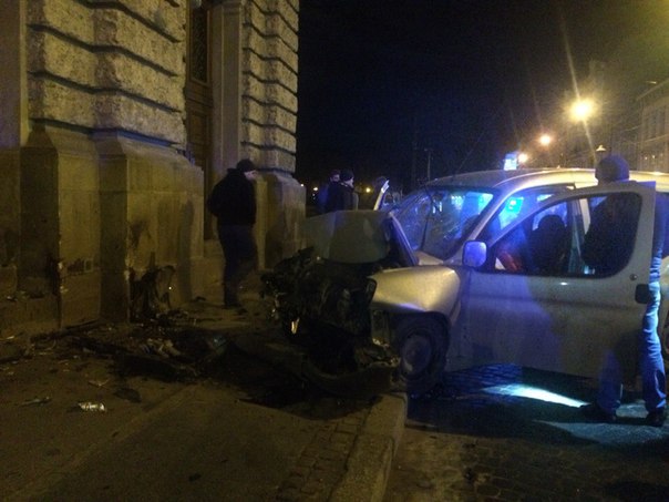 «– Так, дійсно у Львові стався такий інцидент. Авто, яке направлялося на перехрестя Чорновола і проспекту Свободи, потрапило у аварію. В таку годину машин було дуже мало – а це була третя ночі – тому можна вважати, що у водія на перехресті не було жодної перешкоди. Як стверджують, водій рухався з достатньо великою швидкістю, а у Львові вже третій день падає дощ і мокра бруківка. Тому він не справився з керуванням і таким чином влетів у кут Оперного Театру. На момент зіткнення в машині було двоє людей, їх прізвища невідомі. Відомо лише, що машина була з львівськими номерами. Чи вони перебували в стані наркотичного або алкогольного сп’яніння – ніхто заяв про це не робить. Зі слів медиків, що одразу приїхали на місце подій, їх викликали патрульні поліцейські. Пасажира і водія врятували подушки безпеки. Якби не вони, події могли б розгортатися вже з летальним перебігом.