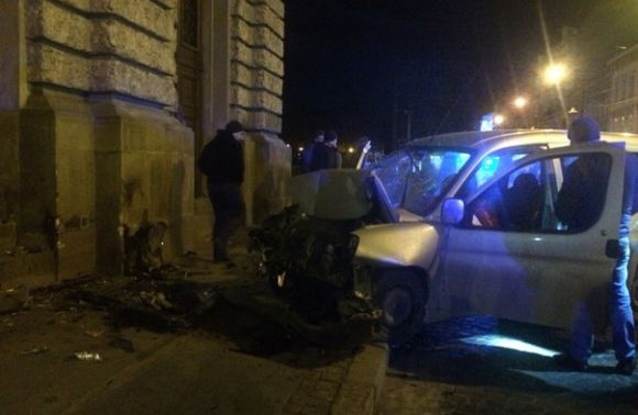 «– Так, дійсно у Львові стався такий інцидент. Авто, яке направлялося на перехрестя Чорновола і проспекту Свободи, потрапило у аварію. В таку годину машин було дуже мало – а це була третя ночі – тому можна вважати, що у водія на перехресті не було жодної перешкоди. Як стверджують, водій рухався з достатньо великою швидкістю, а у Львові вже третій день падає дощ і мокра бруківка. Тому він не справився з керуванням і таким чином влетів у кут Оперного Театру. На момент зіткнення в машині було двоє людей, їх прізвища невідомі. Відомо лише, що машина була з львівськими номерами. Чи вони перебували в стані наркотичного або алкогольного сп’яніння – ніхто заяв про це не робить. Зі слів медиків, що одразу приїхали на місце подій, їх викликали патрульні поліцейські. Пасажира і водія врятували подушки безпеки. Якби не вони, події могли б розгортатися вже з летальним перебігом.