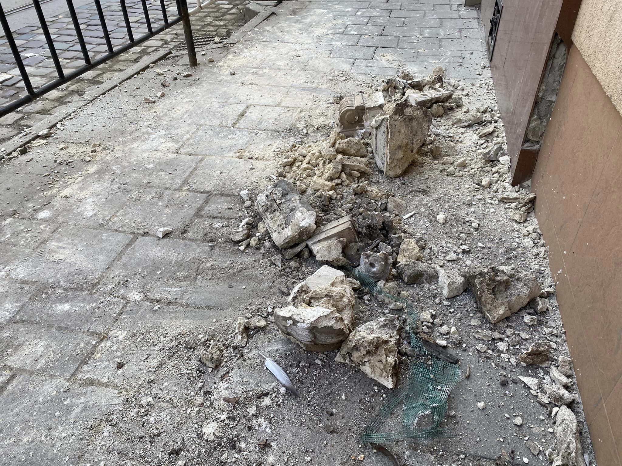У Львові багатокілограмова брила ліпнини впала на тротуар