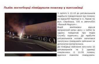 «3 лютого о 21:15 до рятувальників надійшло повідомлення про пожежу в автомобілі «Renault Magnum» на відкритій території на вулиці Стрийській, 330 у Львові. Водій вантажівки відчув неприємний запах диму у кабіні та одразу повідомив про подію Службу порятунку.