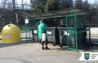 У Львівській запевнили: «Паралельно з миттям вулиць, зупинок, під’їздів у будинках, дезінфекцією транспорту, на території районів Львова проводиться дезінфекція сміттєвих контейнерних майданчиків».