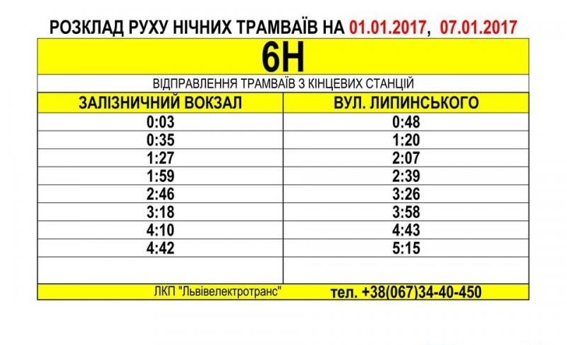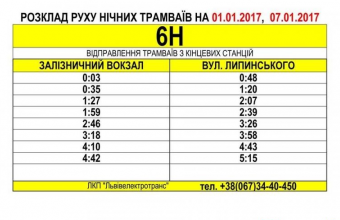 Директор «Львівелектротрансу» Михайло Сидорович запевнив, що у ніч із 31 грудня на 1 січня, а також зі 6 на 7 січня у Львові курсуватимуть нічні трамвайні маршрути.