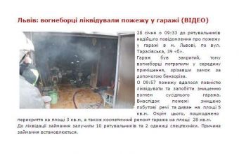 «28 січня о 09:33 до рятувальників надійшло повідомлення про пожежу в цегляному гаражі на вулиці Тарасівській у Львові. Вогнем знищено побутові речі та диван на площі 5 кв.м., пошкоджено перекриття на площі 3 кв.м., облицювання гаражу на площі 28 кв.м.. На даній події врятовано гараж, пожежу ліквідовано о 09:57.