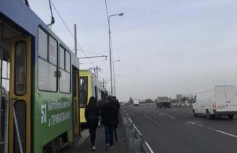 Трамваї №8 стоять на Сихівському мості, а їхні пасажири ідуть пішки.