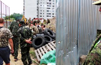 Минулої середи, 6 липня, на території школи поряд із будівельним майданчиком встановили намети. Люди в камуфляжі, що спокійно прогулюються навколо, коли бачать журналістів, переважно тікають та відмовляються говорити. Їхній керівник давати коментар відмовився.