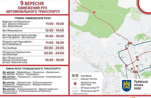 На час проведення змагань буде перекрито або обмежено рух транспорту на різних ділянках маршруту від селища Брюховичі до проспекту Свободи. У зв’язку з цим не курсуватиме тролейбус №13 та зміниться схема руху 20 автобусних маршрутів. Проспект Свободи та проїзд з вулиця Дорошенка на вулиця Беринди будуть закриті для руху приватного транспорту впродовж усього дня 9 вересня.