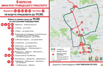 «Проспект Свободи та проїзд з вулиця Дорошенка на вулиця Беринди будуть закриті для руху приватного транспорту впродовж усього 8 вересня. У зв’язку з перекриттям у русі трамваїв №1, №2 та №9, у цей час можливі короткотермінові затримки в центрі міста. А з 8.30 до 12.00 зміниться схема руху автобусів №1а, №17, №22, №41 та №53. Тролейбуси №33 не працюватимуть до 11.30», – повідомили також у міськраді.