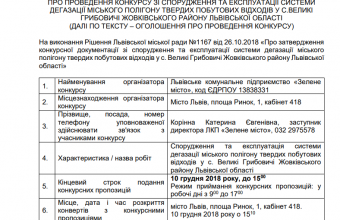 Львівське комунальне підприємство «Зелене місто» оголосило конкурс зі спорудження та експлуатації системи дегазації міського полігону твердих побутових відходів у Грибовичах.