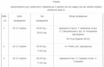 Фрагмент «Графіку призупинення руху транспорту терміном до трьох хвилин (на час кадру) під час зйомок серіалу «Київська зірка 2».