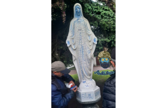 Повідомляють, що на вулиці Любінській у Львові біля Будинку меблів 15 травня хтось розмалював статую Богородиці й написав на ній лайливі слова.
