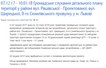 Громадське слухання детального плану території в районі вулиць Ряшівської, проектованої, Щирецької, 8-го Скнилівського провулку у Львові, яке розпочалося в четвер, 7 грудня, триватиме до 10 січня.