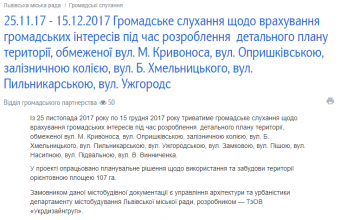 Про це повідомили в прес-службі Львівської міськради, де також розповіли: «У проекті опрацьовано планувальне рішення щодо використання та забудови території орієнтовною площею 107 га. Замовником містобудівної документації є управління архітектури та урбаністики департаменту містобудування Львівської міської ради, розробником – ТзОВ «Укрдизайнгруп». Місце проведення – Великий сесійний зал Львівської міської ради (площа Ринок,1). Початок – о 18.00. Пропозиції можна подавати до 15 грудня 2017 року до відділу громадського партнерства управління «Секретаріат ради» через Центр надання адміністративних послуг за адресою: Львів, площа Ринок, 1. Відповідальна за організацію розгляду пропозицій – Дзвенислава Челепіс, телефон – 032 297 57 63».
