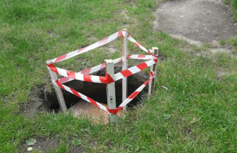 На дитячому майданчику між будинками №20 на вулиці Хоткевича й №40 на проспекті Червоної Калини утворилося внаслідок злив провалля.