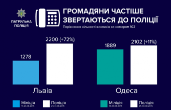 Зокрема, у Львові в міліцію у період з 17 по 23 серпня (шість днів) надійшло 1278 викликів, у той час як у поліцію в період з 25 серпня по 31 серпня (шість днів) – 2200, що на 72% більше. Натомість в одеську міліцію з 18 по 23 серпня (п'ять днів) надійшло 1889 викликів, а в поліцію з 25 серпня до 30 серпня (п'ять днів) – 2102 викликів, що на 11% більше.